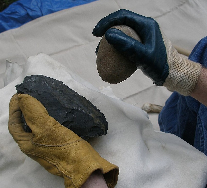 Example of hard hammer percussion, where a stone hammer is used to strike and shape flint for tool production.
